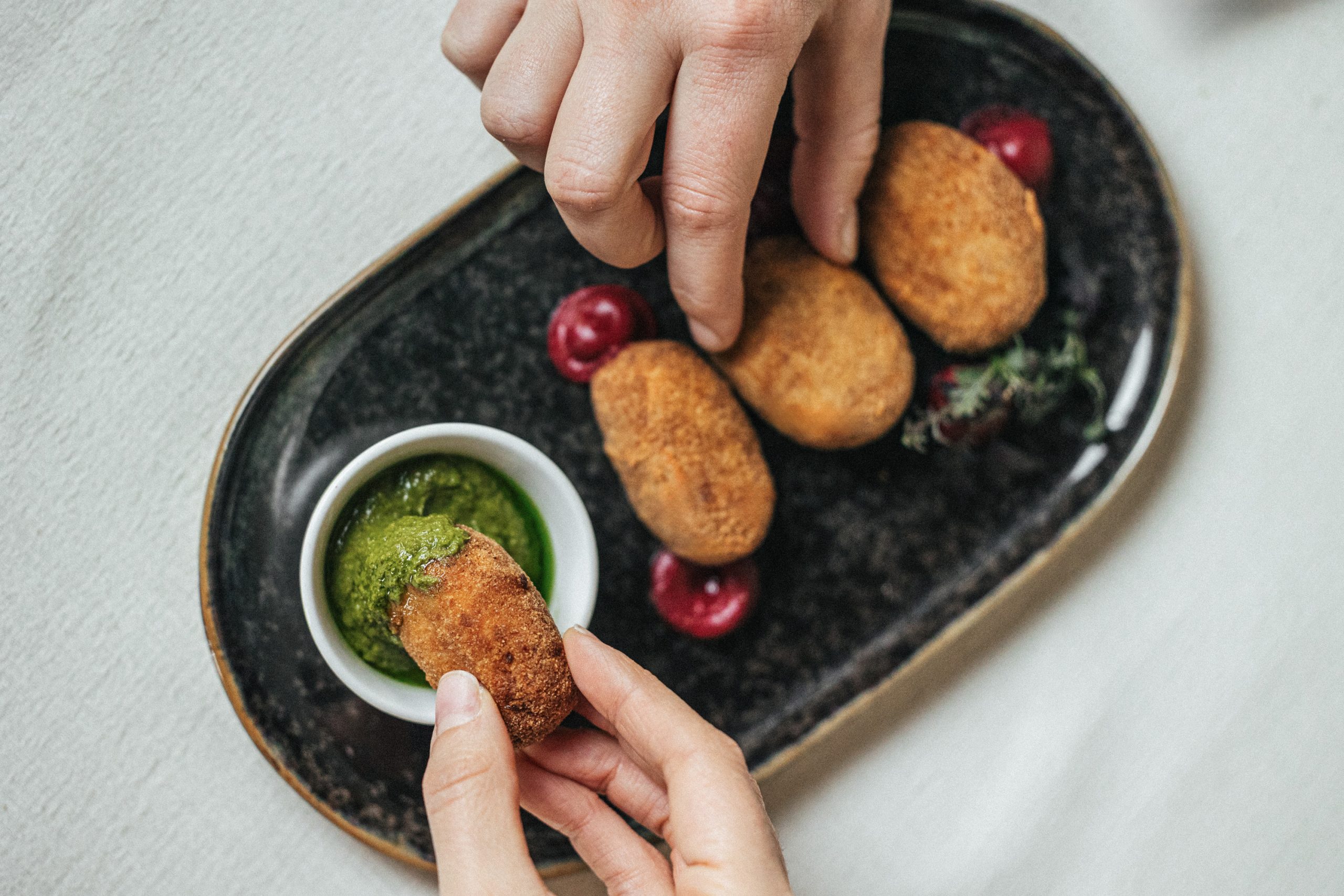 Mondeghili, tartare di peperoni marinati e yogurt all’aneto
